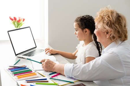 Grandmother teaching to granddaughter with the help of the computer. Worried old teacher helping girl studying and doing homework on laptop at home, private lesson