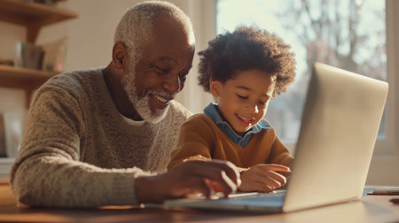 Senior black man helping his grandson to study with laptop, grandfather helping kid with homework. Grandpa is teaching grandson, home education, deep family connections, AI generative