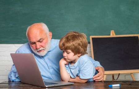 Grandfather talking to grandson. Concept of education and teaching. Teacher and schoolboy using computer in class over blackboard. Daddy and his little son.