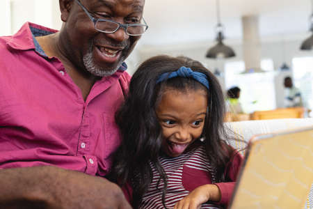 Happy multiracial grandfather with granddaughter making face watching video over digital tablet. Home, wireless technology, unaltered, family, togetherness, childhood and retirement concept.