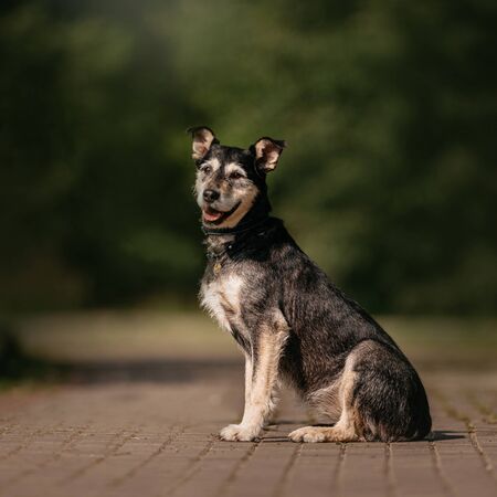 cute mixed breed dog sitting outdoors in summer