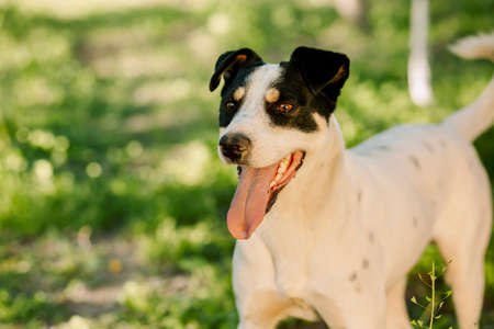 Funny white-black-brown mongrel dog looks at the camera and smiles, sticking out his tongue. High quality photo