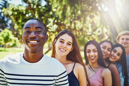 Theyre the best people ever and theyre my friends. Portrait of a group of friends standing in a row outdoors.