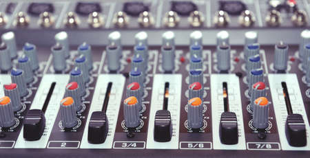 Professional Audio dj mixer console, sound tools and gear, studio equipment picture, selective focus picture of faders and knobs of mixer