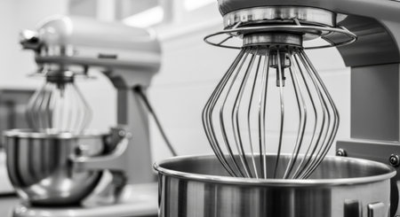 Closeup of a professional electric mixer in a kitchen, monochrome