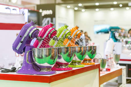 Many colorful and modern stand food mixer machine for industrial or home on table on blur background