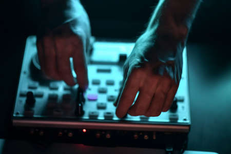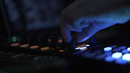 DJ mixer in club night party bright colorful buttons, fingers with buttons. Music controller in night club, dark shot, music in night clubs