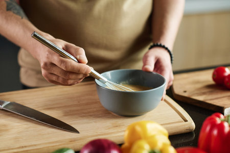 Closeup of unrecognizable man beating up eggs with whisk while standing by kitchen table