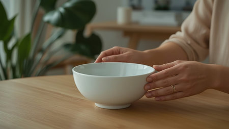Close-up of a woman's hands gently holding a white ceramic bowl on a wooden table. The background features blurred indoor plants and a warm, cozy home setting.