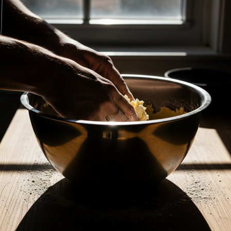 Close-up side profile of hands mixing pumpkin pie crust dough in a metal bowl under harsh window lig