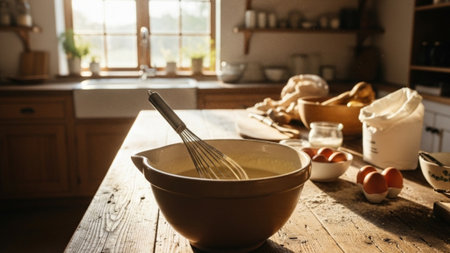 Close-up of hands mixing thick batter in a ceramic bowl using a wooden spoon, illuminated by warm sunlight. Baking ingredients like flour, eggs, and milk are visible in the background, capturing a cozy cooking moment.