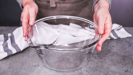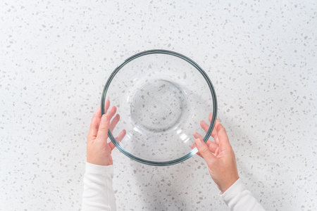 Step by step. Flat lay. Glass mixing bowl on the table.