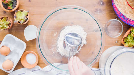 Step by step. Flat lay. Mixing ingredients in a glass mixing bowl to bake chocolate cookies.