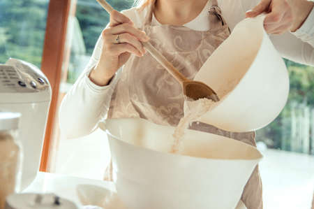 Woman pours flour into the dish and prepare dough for homebread. Photo taken in the light of natural sun and studio lamps. It contains delicate artistic noise and a vintage color grading
