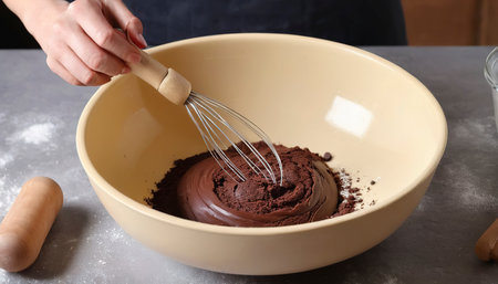 mixing dough for chocolate cake in a bowl. female hands and a kitchen whisk. recipe step by step