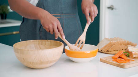 Chef in a black apron is preparing a healthy meal in a wooden bowl.