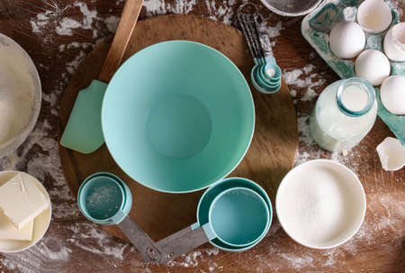Flat lay. Mixing ingredients in a glass mixing bowl to bake chocolate cookies.