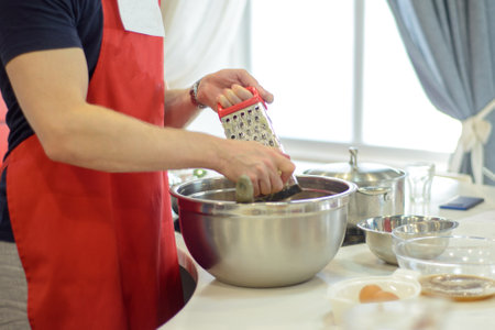 man in a red apron in the kitchen rub potatoes on a grater