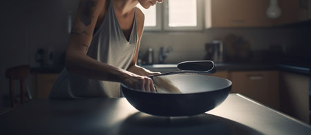 Woman wiping frying pan with paper towel indoors. AI Generative