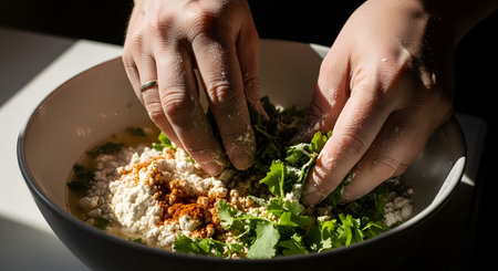 Hands vigorously mix a dough combination with flour, green herbs, and red spices in a white ceramic bowl. The close-up captures the messy, tactile process of homemade cooking and food preparation.
