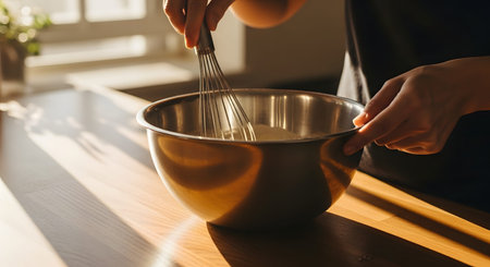 A close-up of hands using a wire whisk to mix ingredients in a stainless steel bowl on a wooden counter. The sunlit kitchen setting suggests baking or cooking preparation.
