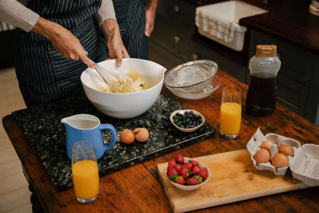 Grandmother preparing batter for pancakes