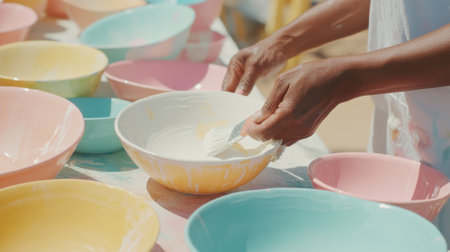 Close up of a person whisking batter in a yellow bowl surrounded by colorful mixing bowls preparing ingredients in a modern kitchen.