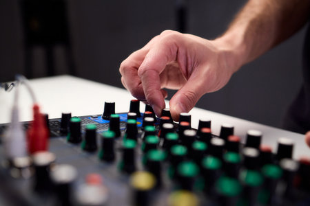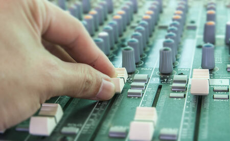 Hand adjusting audio mixer in dark studio, music instrument concept