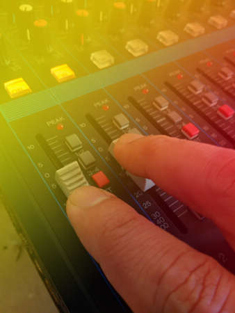 Close Up Man Hand Controlling Audio Mixer, with yellow and Red Light Flare