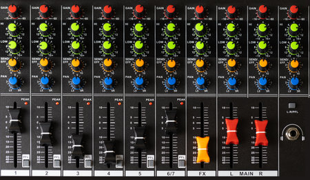 Professional Audio dj mixer console, sound tools and gear, studio equipment picture, selective focus picture of faders and knobs of mixer