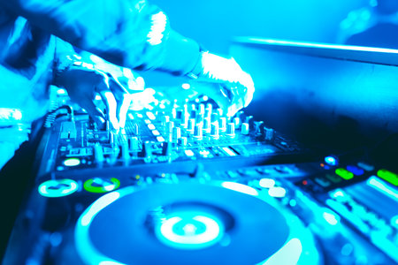 DJ mixer in a nightclub with a background of glowing lights from buttons