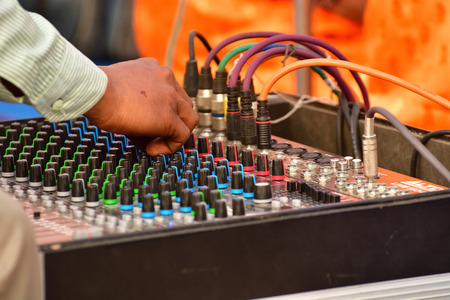 Audio mixer, music equipment in a live concert. Adjusting audio mixer