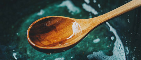 Close-up view of a wooden spoon resting on a dark surface with water droplets