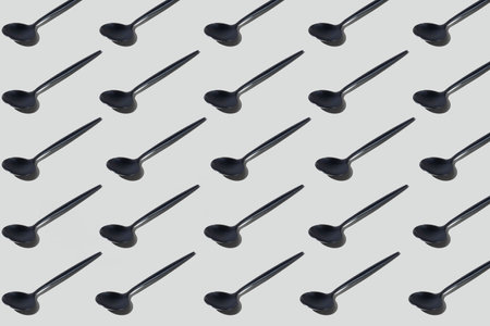Colorful pattern of black spoons on gray background. view from top. High quality photo.
