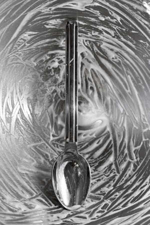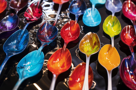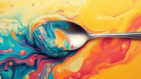 Spoon resting on vibrant colorful swirls of liquid paint mixing