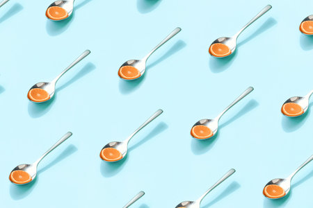 Pattern of spoons with orange slices on isolated light blue background. Summer fruit diet. Minimal summer fruit concept. Citrus sources of carotenoids, flavonoids and vitamin c.