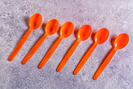 Set of orange plastic spoons on gray background, flat lay, top view.