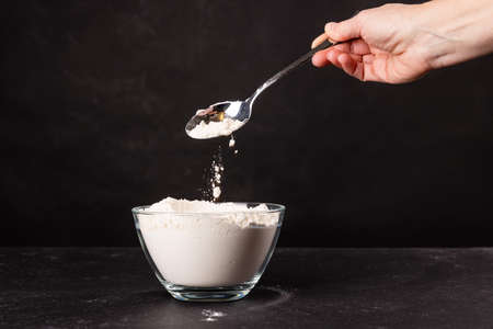 Female hand sprinkles flour in a bowl with a spoon on a black background