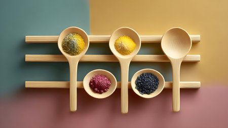 Assorted ayurvedic spices in wooden spoons and bowls on colorful geometric background.