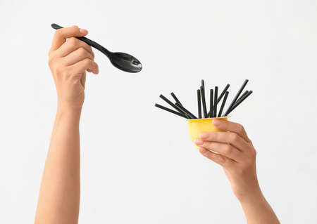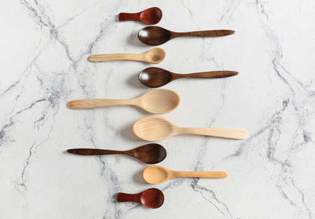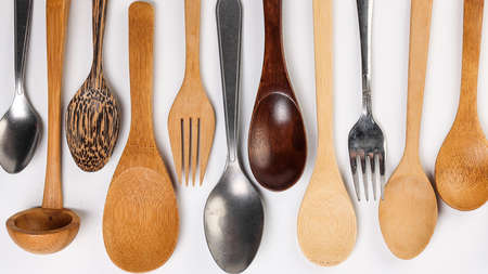 Varity of wooden metal plastic spoon kitchen tableware on white background copy text space