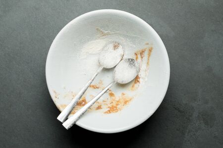 Overhead of a pair of flour-covered spoons in a dirty bowl