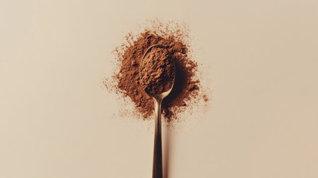 A flat lay of a spoon holding cocoa powder, styled on a soft, off-white background for a clean, minimalist look.