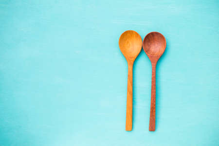 Wooden spoon with natural texture on blue texture background, kitchen equipment, eco product, craft object