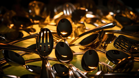 rows of spoons filled with various herbs and spices are arranged in a conceptual minimalist sculpture. the spoons, painted in dark gold and silver, feature dot-painted colors that create an optical blending effect. this oriental minimalism-inspired composition stands out against a white background, creating surreal juxtapositions with its dotted pattern. ai generated