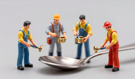 Four tiny figures in overalls and helmets gather around a large spoon, working together with tools. They seem determined in their amusing task in this playful scene.