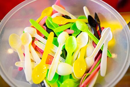 Closeup of multicolored ice cream spoons in bowl on counter at store