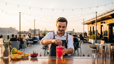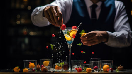 A bartender is sprinkling fruit into a cocktail glass. Generative AI image.