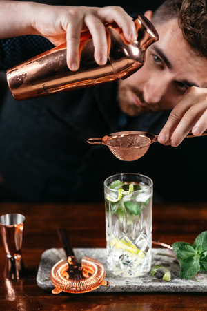 barman preparing and pouring gin cocktail. mojito cocktail drink with bar background