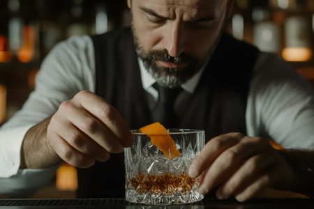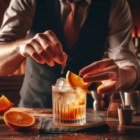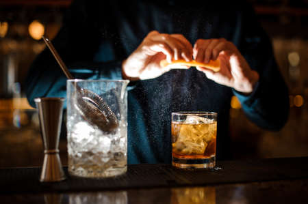 Professional bartender garnishing a crystal glass of Old Fashioned cocktail with orange peel in a dimly lit bar