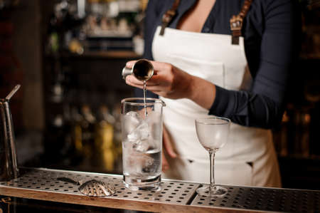 Sexy barman woman pouring vodka into a cocktail glass with ice for making summer drink